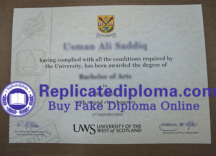 The University of the West of Scotland diploma doesn’t use the crisp, white paper commonly found in English universities, but rather a warmer, slightly textured khaki paper. This color evokes images of ancient sandstone warmed by the autumn sun along the River Clyde, or the fertile, bare soil of the Ayrshire hills. The edges of the paper lack sharp corners, possessing a gentle, hand-cut curve, seemingly suggesting that knowledge and skills, like the earth, can bear real life. Buy fake University of the West of Scotland diploma, buy fake University of the West of Scotland degree certiciate